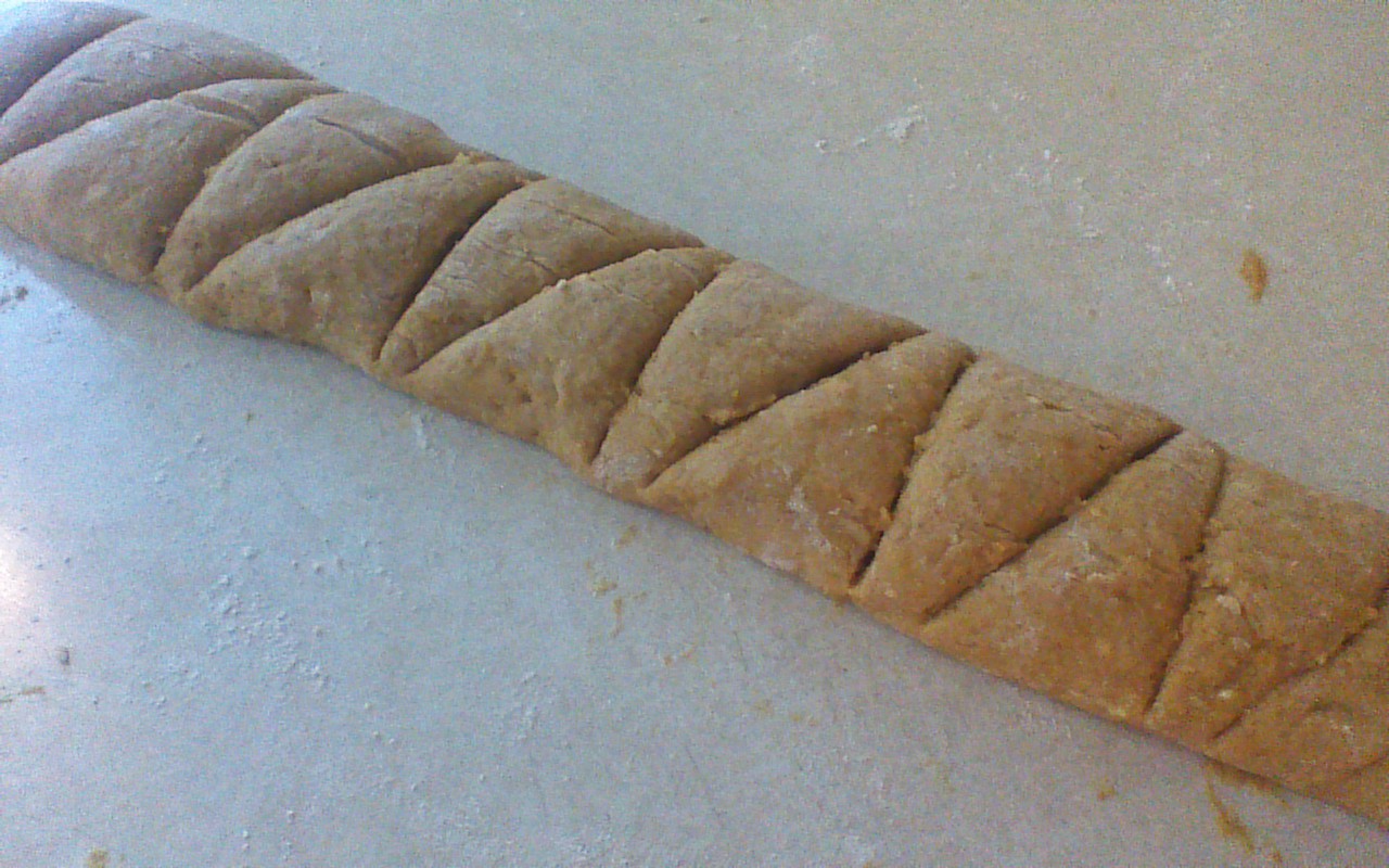 picture114  Knead dough for a few minutes, turning over the dough occasionally and adding more flour if the dough feels very sticky.  Shape the dough into a long rectangle, approximately 3 inches wide and 1 inch high.  With a butter knife or a spatula, cut a “zig zag” pattern into the dough so that you will have 18 wedge-shaped scones.
