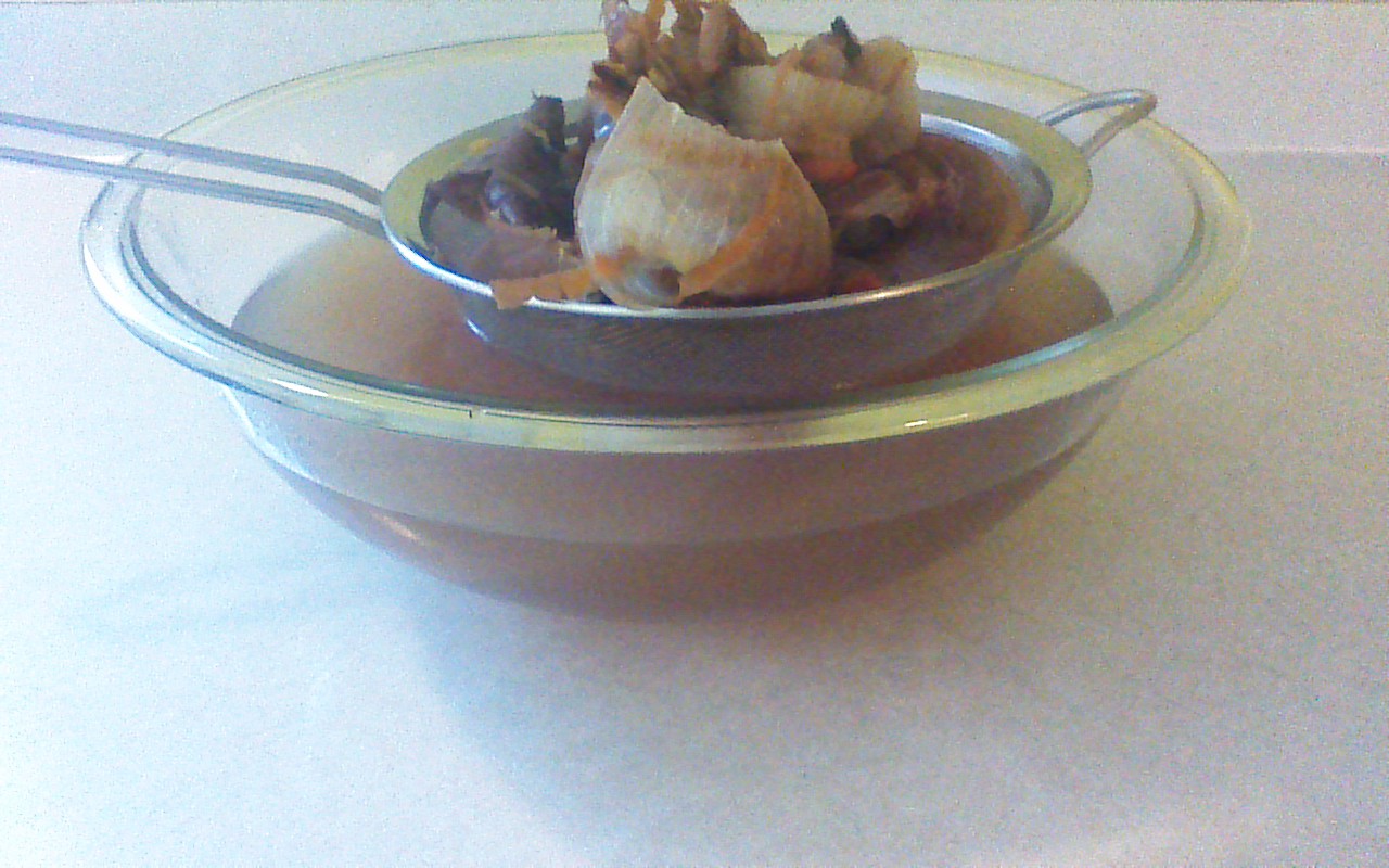 picture119Bring your pot to a boil and simmer, covered, for one hour.  Next, strain your broth through a sieve into a large bowl (or into another pot).  It may be helpful to scoop out the large pumpkin skins with a slotted spoon before pouring everything through a sieve.  Add the vegetable scraps to your garden compost bin, and let’s use that wonderful, vitamin packed broth!  You’ll need 4 cups for this recipe.  If you have extra, freeze it for the next time you need any sort of broth.  I leave my broth unseasoned, and adjust individual recipes as needed.  Bland is fine, at this point.