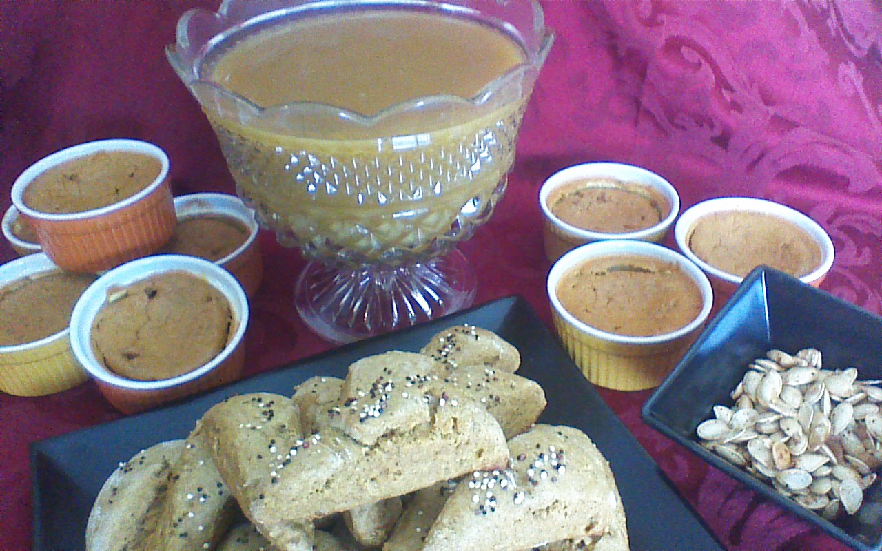 Knowing that pumpkins are stuffed full of nutritional gems (beta carotene, vitamin C, vitamin E, potassium, and fiber, to name a few), I resolved to turn mine into something wonderful.  As it happened, my pumpkin was bountiful enough for four somethings:  Pumpkin Custard, Sesame Roasted Pumpkin Seeds, Petite Pumpkin Scones, and Indian-Inspired Pumpkin Potato Soup.  Each recipe is included below.  I hope you enjoy them, and I look forward to your comments!