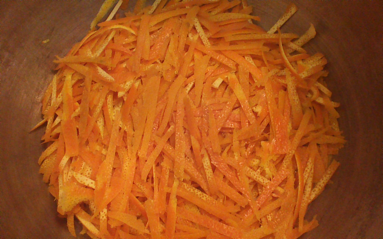 Step 3) Slice your orange peels into thin strips using a paring knife. My strips ended up being about 1/4 inch wide and 2 to 3 inches long. The dimensions aren’t terribly important.