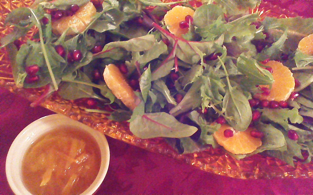 Simply fill a serving bowl with 8 cups of a 50/50 mixture of baby spinach and mixed salad greens. Sprinkle with 1/2 cup of fresh pomegranate arils. Peel 2 oranges or clementines, slice, and tuck into salad. Serve with a drizzle of orange marmalade.