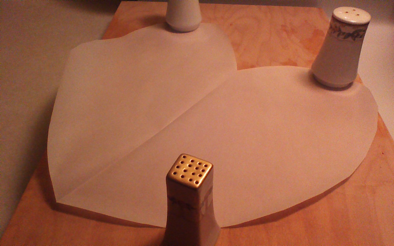 Step 2) Open your parchment hearts and anchor them onto your work surface, so they don’t curl up (annoying!) as you are layering your ingredients. I find that salt and pepper shakers are just the right size for this.