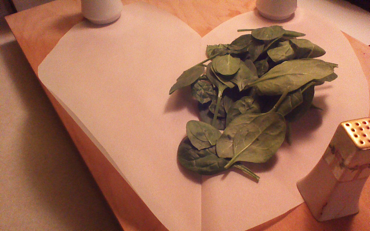 Step 3) Place two cups of fresh baby spinach on one half of each parchment heart. It’s OK if the spinach overlaps the center of the heart a bit, but leave 2 inches of empty space around the edge. You’ll need that space later!