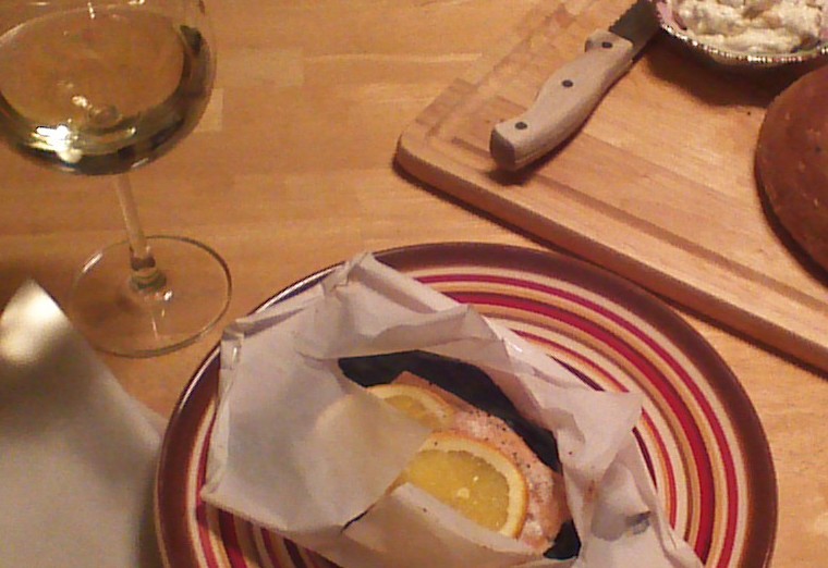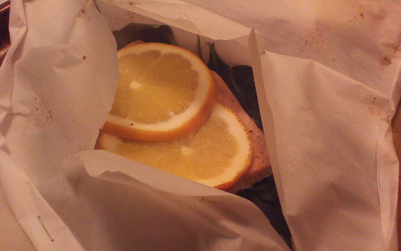In the spirit of Valentine’s Day, there is a lot to love about this meal. First, wild salmon is a heart healthy delicacy with which Crowded Earth Kitchen recommends indulging as often as your budget allows. Baked on a bed of fresh baby spinach, dressed with a bit of citrus, and served with a delicious whole wheat bread (see 2/11/14 post), this meal is a nutritional superstar. Second, baking with parchment is the perfect combination of “really easy but looks complicated,” which makes it a perfect technique for impressing your guests without inducing a pre-dinner, kitchen meltdown.