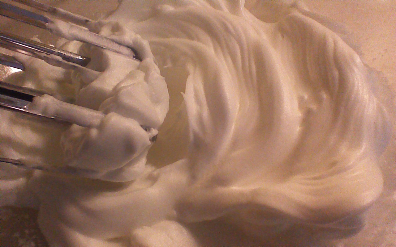 Step 2) Add white sugar and ground cloves – 1 tablespoon at a time – to egg white mixture. Beat at high speed for 3 – 5 minutes until mixture is glossy and stiff peaks form. When you lift the beater out of the mixture now, the peaks should stand up straight.