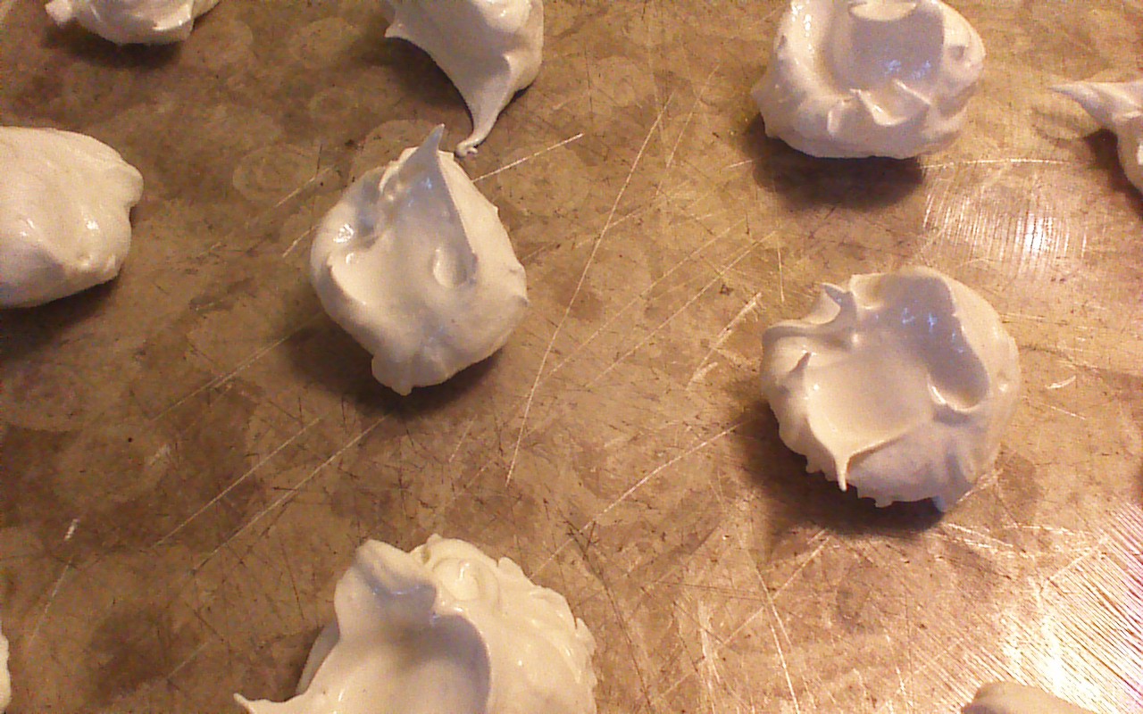 Step 3) Drop tablespoonsful of the meringue mixture onto a greased cookie sheet, leaving 1 – 2 inches between meringues. Bake in a preheated 300 degree oven for 20 minutes.