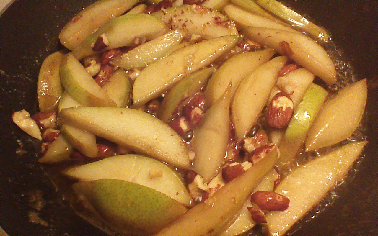 Step 2) Add pears. Begin caramelizing over medium heat, loosening the pears often with a nonstick spatula.