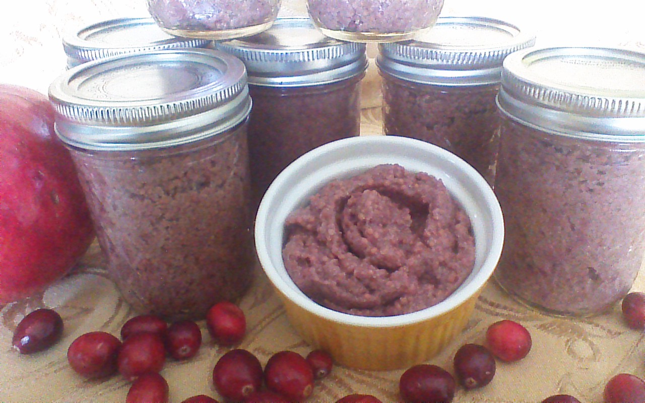 Step 1) Combine mustard seeds, whole cranberries, and vinegar in a large glass bowl.  Cover and let sit for two days.  The mustard seeds will absorb vinegar and expand, so make sure your bowl is big enough!
