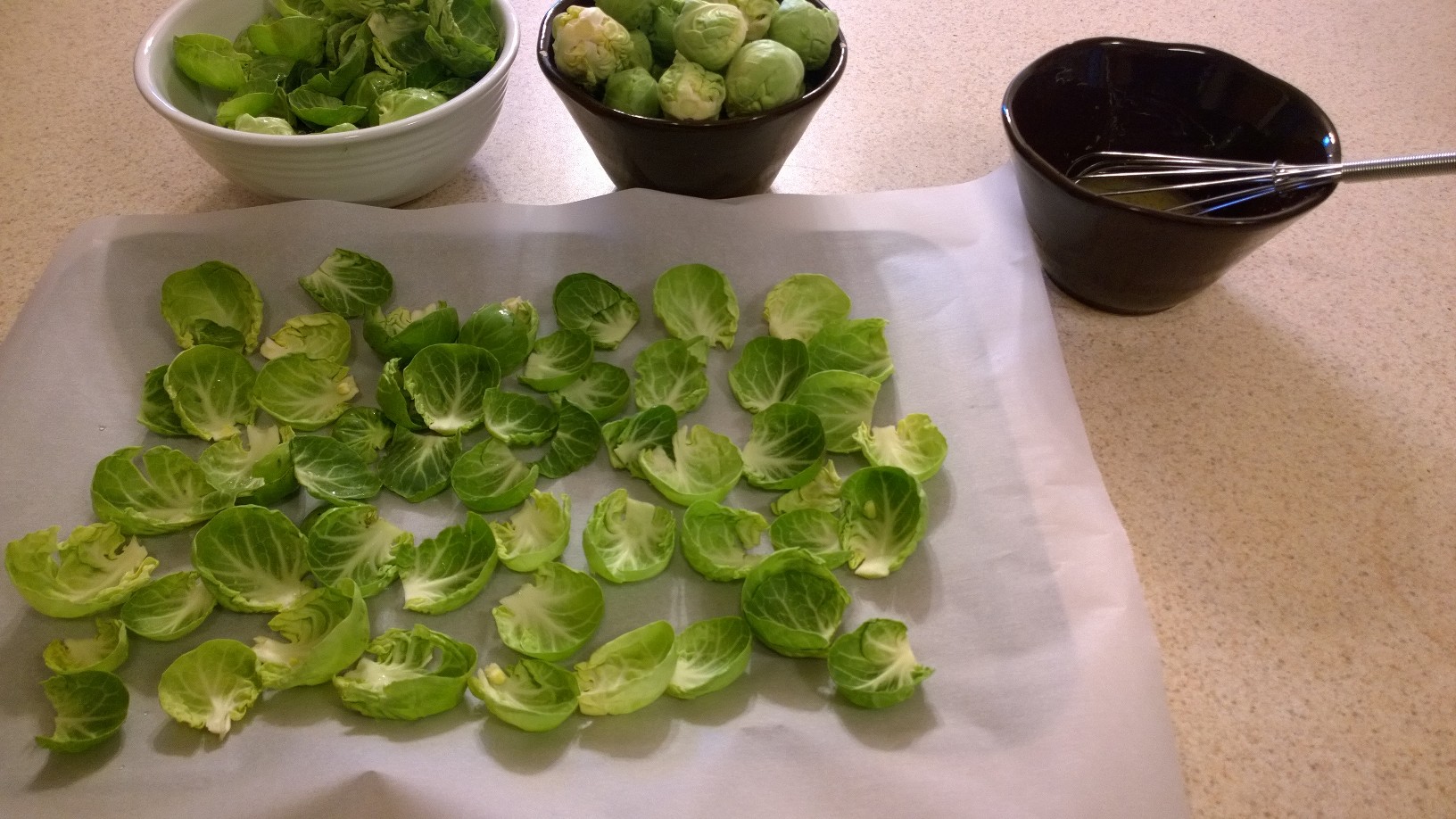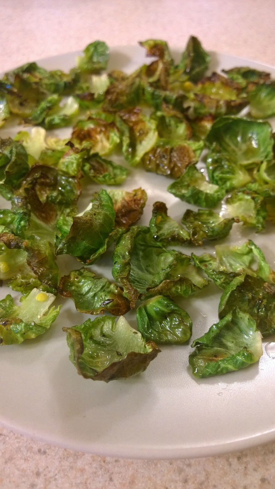Toss your sprout leaves in the dressing and bake on your lined sheet at 350 for 8- 10 minutes or until crisp.
