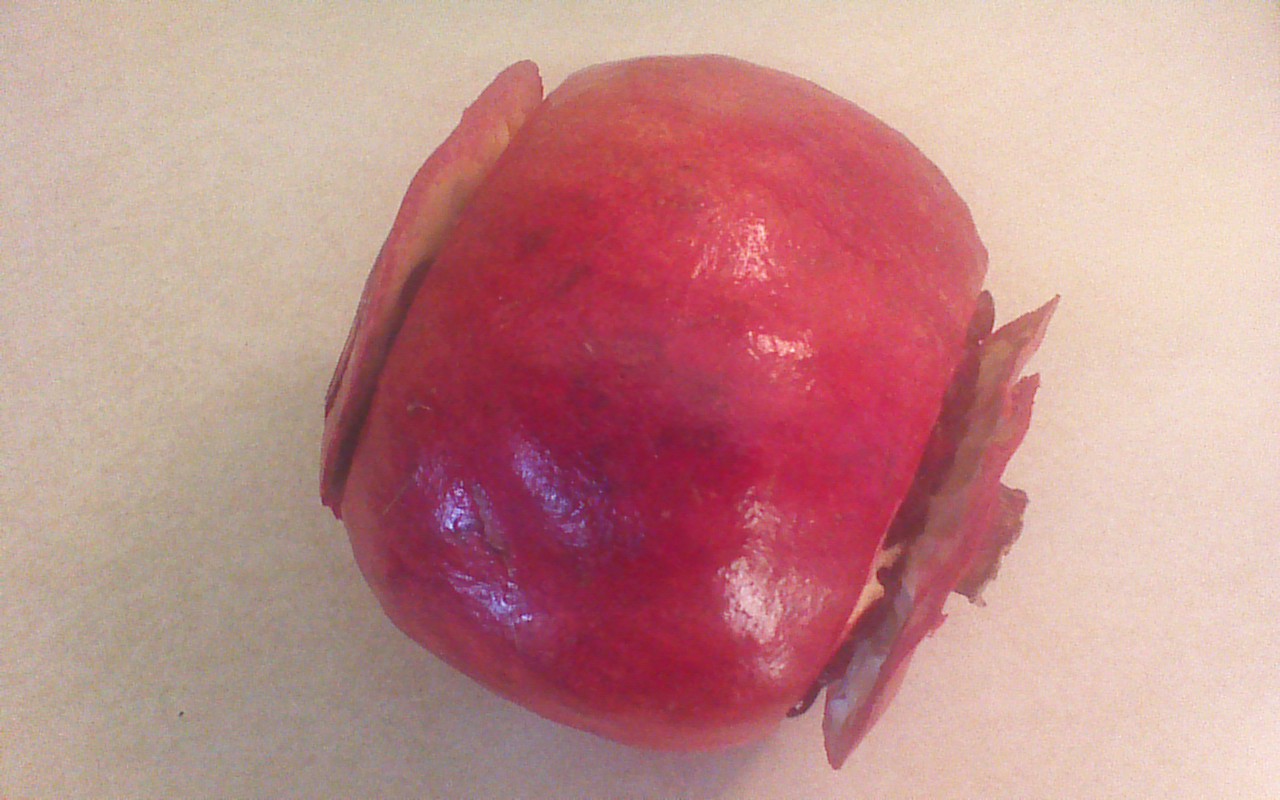 Step 1) Use a paring knife to score a pomegranate all the way around in a circle, about 1/2 inch from each end. Use the tip of the paring knife or a finger to gently pull up the leathery skin. After the ends are loosened, simply pull them off.