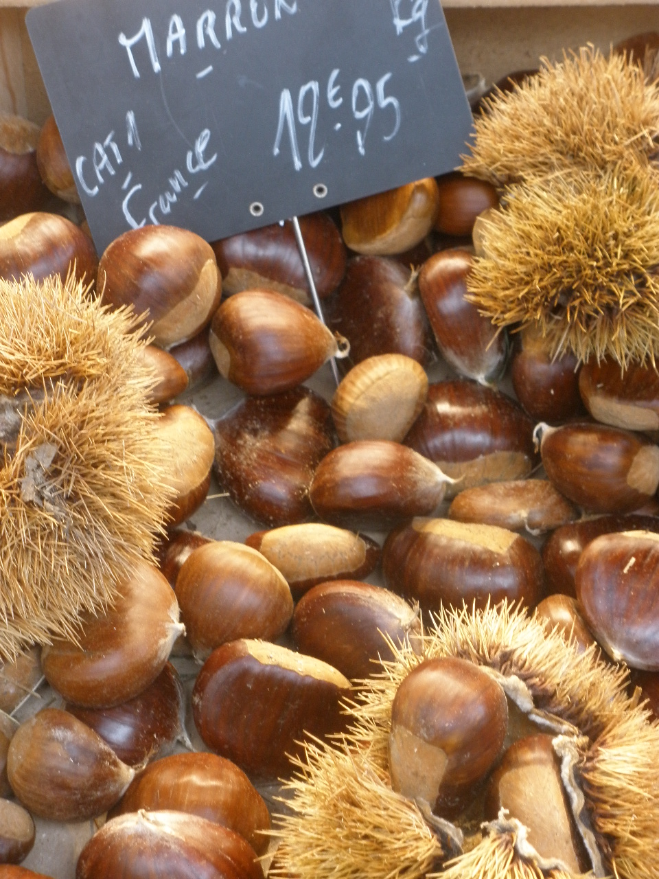 Back home in the United States, I was able to find fresh chestnuts at a local, upscale market.  I paid $7.49 for 1.5 pounds, enough to make 3 cups of crème de marron (that’s a LOT of chestnut cream… did I mention I fell in love?)