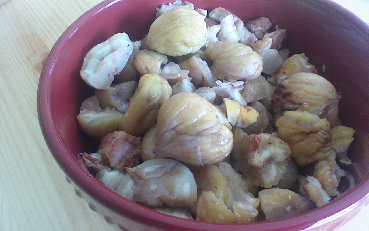 picture282Step 3) When cool enough to touch (but not cold!), peel chestnuts by pulling back on the points of the scored X’s.  Be patient, this takes a little while.  If the chestnuts become too cold and peeling becomes difficult, return them to boiling water for a minute or two.  You will end up with about 4 cups of peeled chestnuts.