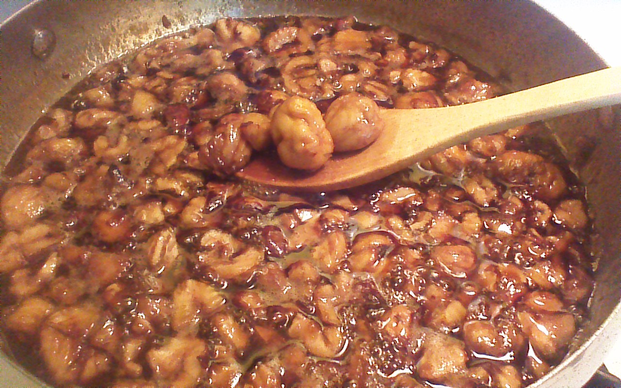picture287Step 4) Combine 2 cups of water, the brown sugar, and the white sugar in a pot.  Heat (low-medium) and stir until sugar dissolves.  Add peeled chestnuts.  Simmer, uncovered, for about 15 minutes until sauce thickens and just begins to caramelize.