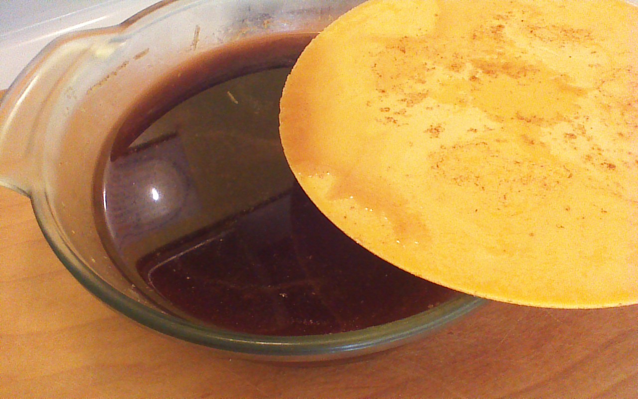 Step 2) Strain broth into a large bowl and place in freezer.  As the broth cools, the saturated fat will rise to the top and solidify.  You will be able to “lift” the saturated fat right off of the broth as shown, and discard it.  Your broth will not picture378be completely fat-free, but will be much lower in fat (and have a less oily, more pleasing taste) than if you had skipped this step.