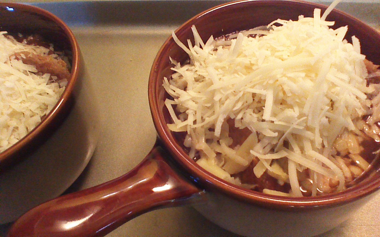 French Onion Soup.  The ultimate peasant food featuring humble ingredients expertly prepared, with a taste that is fit for a king.  It is easy to understand why French cuisine is so revered, when one considers the flavors French cooks have managed to coax from little more than field onions, bones, and stale bread.