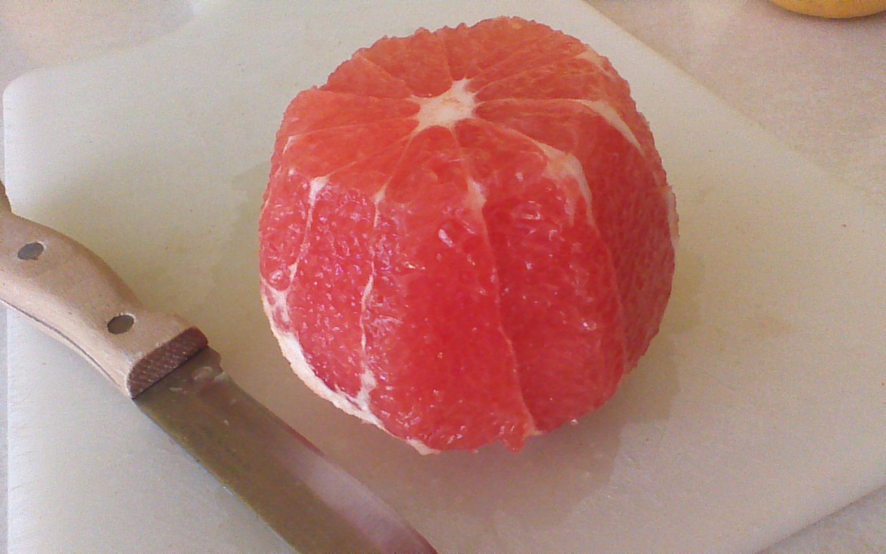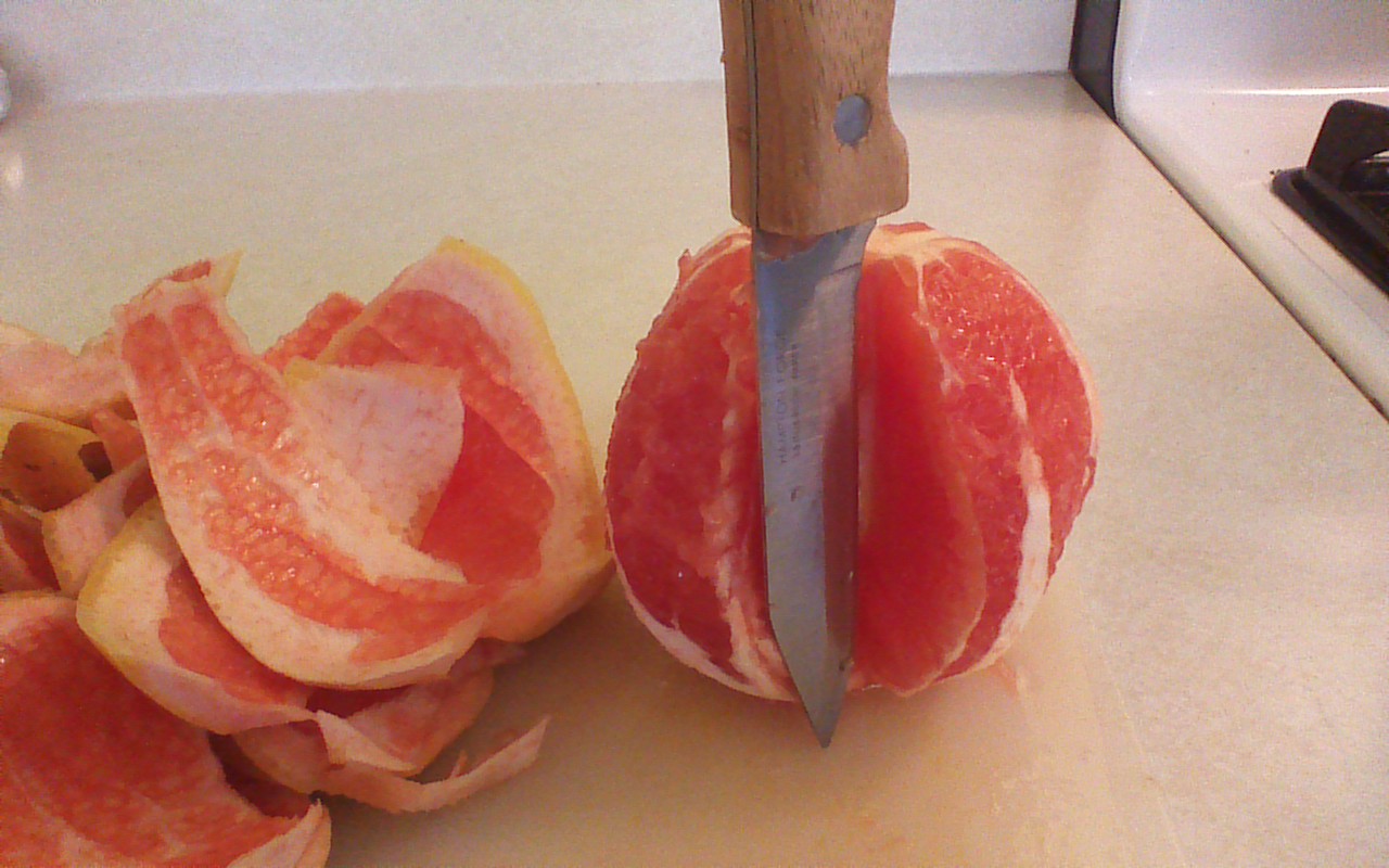 Step 1) First, we need to section the grapefruit so that we can use the pulp and juice, but not the membranes (in other words, all of the pink, none of the white). This isn’t difficult, but it will take a few minutes. Start by cutting the top and bottom half inch off, straight across. You should see pink. Then, use a paring knife to slice down the sides, removing the peel and all of the white, as shown.