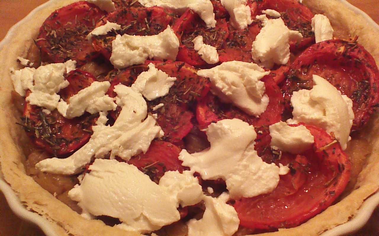 This is the fun part, where all of your efforts come together! First, cover bottom of your tart shell with caramelized onions. Second, arrange your oven-dried tomatoes on top of the onions. Finally, top it all off with little spoonsful of Chevre cheese (4 ounces total). Bake at 375 degrees for about 3 minutes, until the Chevre looks melty and irresistible. Remove from oven and slice with a very sharp knife. Enjoy this remarkable dish!