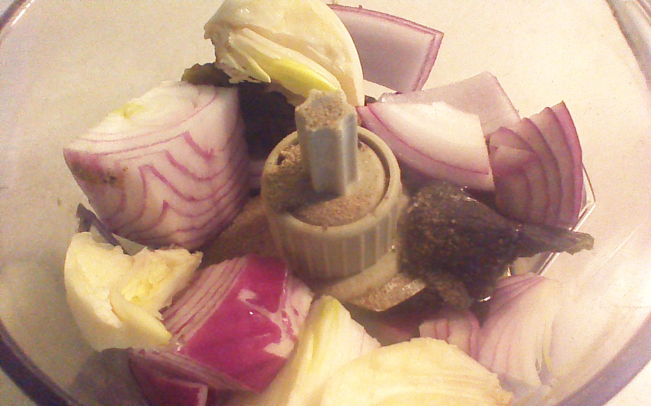 Step 2) Place peppers, onion, garlic, vinegar, molasses, and olive oil in a small blender or food processor. Puree until smooth.