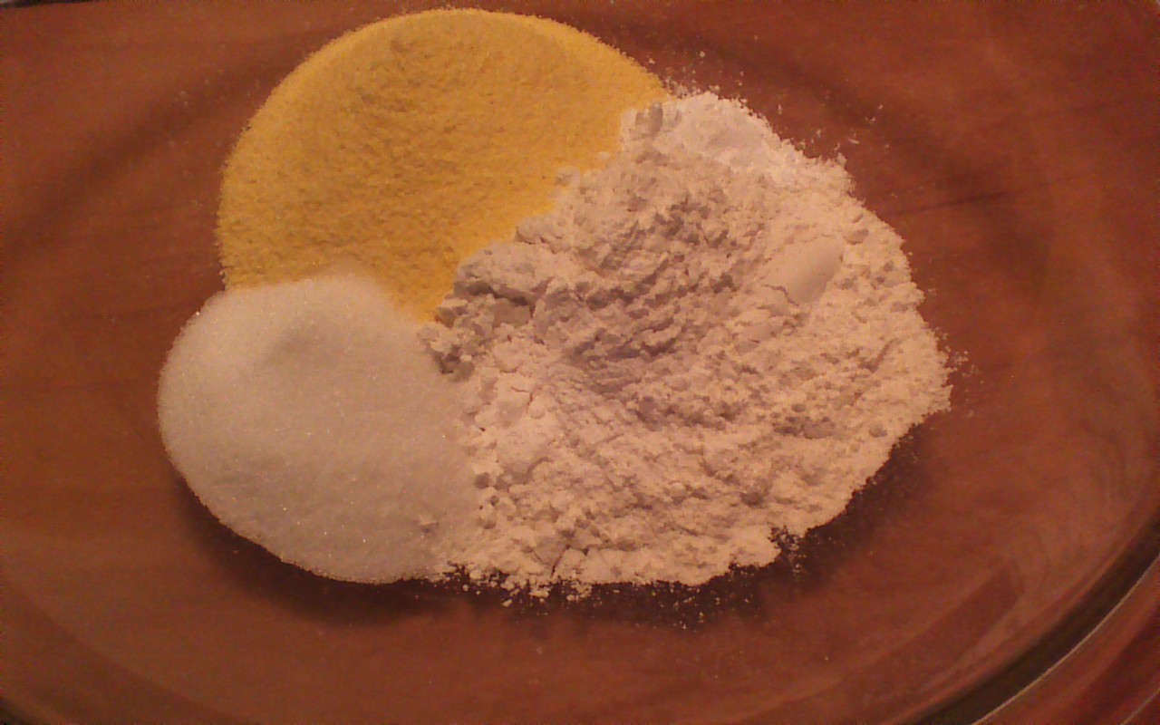Step 1) Combine flour, cornmeal, sugar, and baking powder in a mixing bowl.