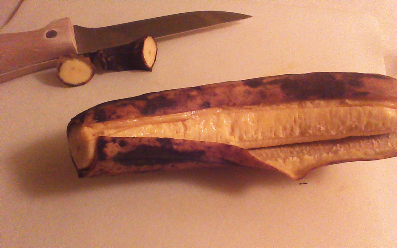 Step 5) Remove plantains from skins and cut into 1/2 inch thick slices.  It is sometimes difficult to peel plantains “top to bottom” like a banana.  An easier way to peel plantains is to cut through the peel from top to bottom (as shown), and then pull pack the peel as if you were opening a picture526book.