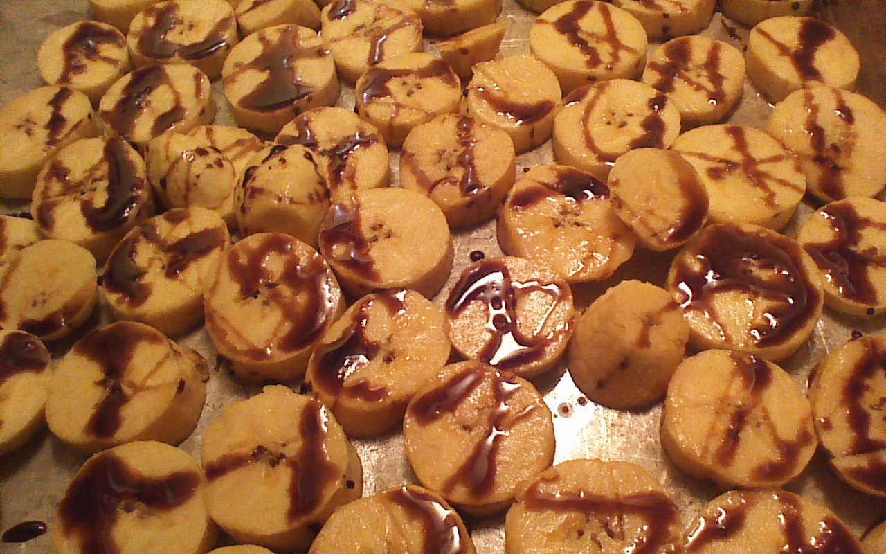 Step 6) Place plantain slices in a single layer on one baking pan, and drizzle with molasses.  OPTIONAL:  melt 1-2 tablespoons of coconut oil on stovetop or in microwave for a few seconds, and drizzle over plantain slices.  This will add back additional “fried” flavor and texture, but will also introduce additional fat and calories.  picture527Your decision.