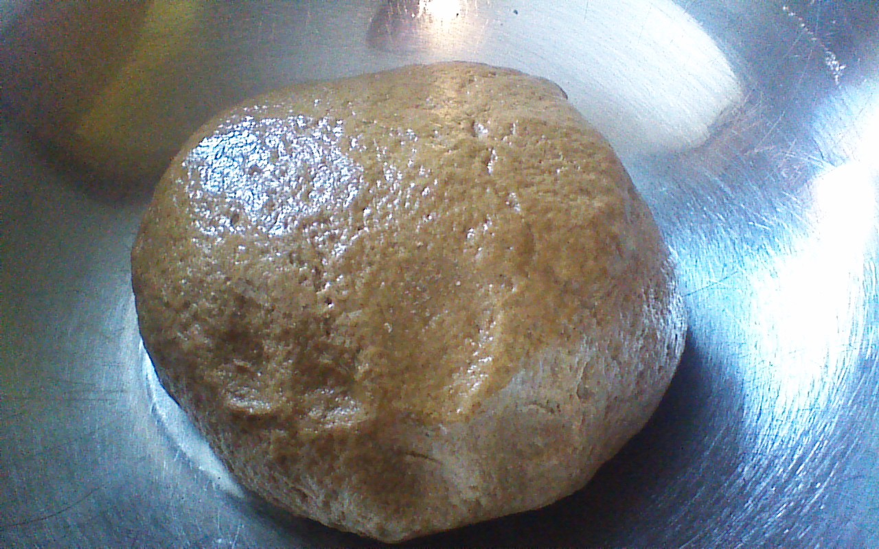Step 5) Shape kneaded dough into a ball and let rise in a large greased bowl for 90 minutes.  It helps to place the bowl in a warm (not hot) location, and to cover the picture394bowl with a thin towel.  (Bread enthusiasts call this a “proofing towel.”)