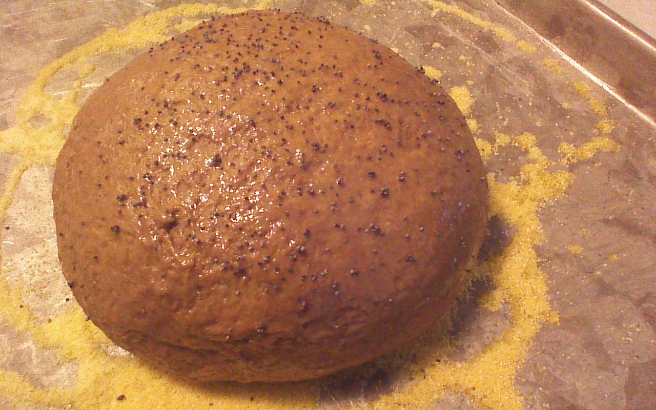 Step 9) Brush the top and sides of your dough with a lightly beaten egg yolk.  If you don’t have a pastry brush, just blot the egg yolk onto the dough with a napkin.  If you wish, you may now sprinkle the dough lightly with a “garnish.”  Ideas include quinoa, poppy seeds, sesame seeds, or even a bit of cinnamon.  I’ve sprinkled a few poppy seeds on the loaf pictured here.  Also if you wish, you may gently score the top of the loaf with a serrated knife.  This will make your loaf look all fancy schmancy, but don’t get carried away – I don’t recommend more than 2 or 3 knife marks, and don’t cut any deeper than 1/2 inch.
