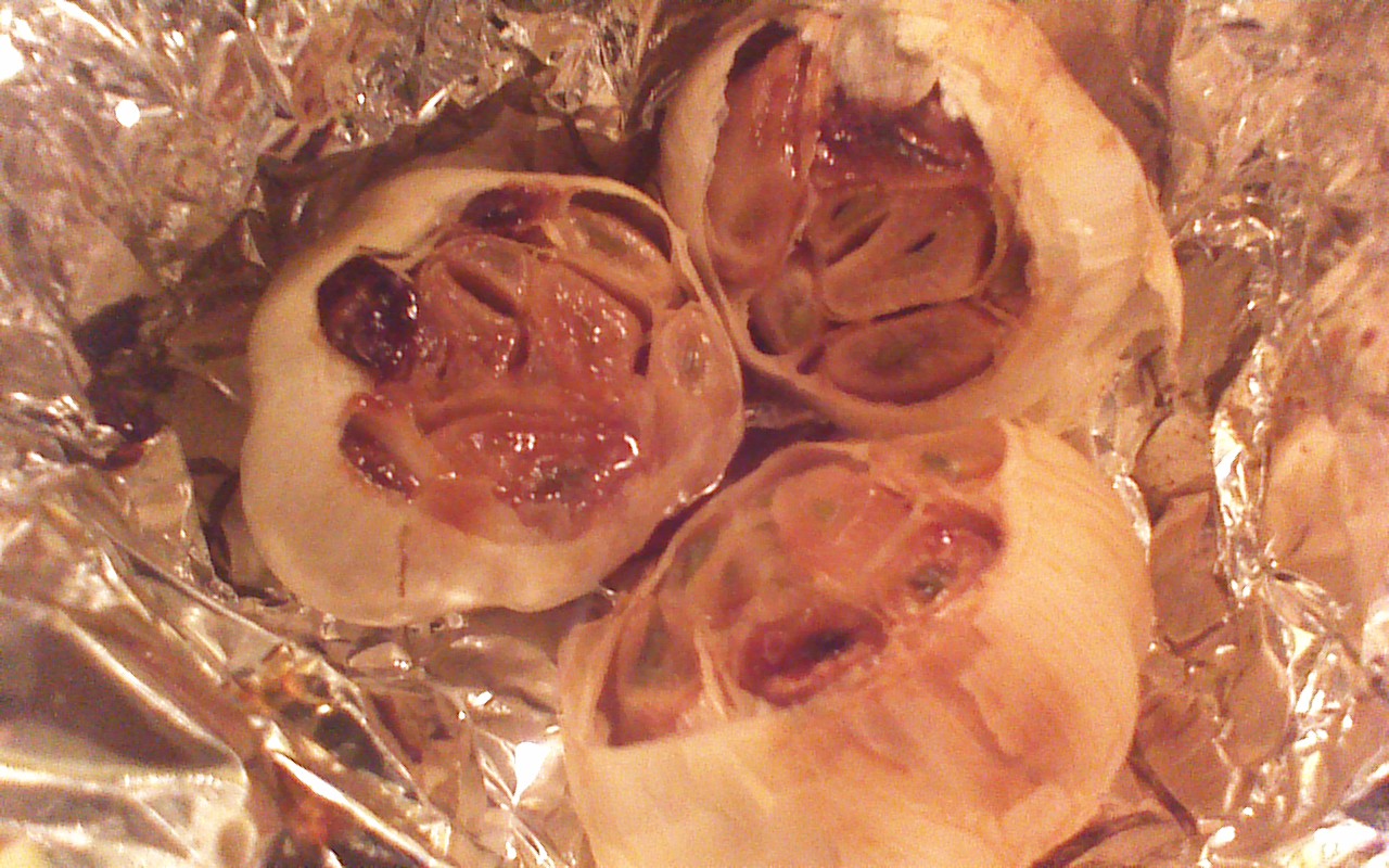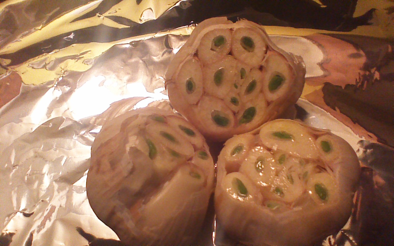Step 1) Cut the tops off of each bulb of garlic as shown. Place all three bulbs of garlic in the center of a large square of foil. Drizzle 1 tablespoon olive oil over the tops of the bulbs. Gather up the sides of the foil and pinch together above the garlic. Set aside.