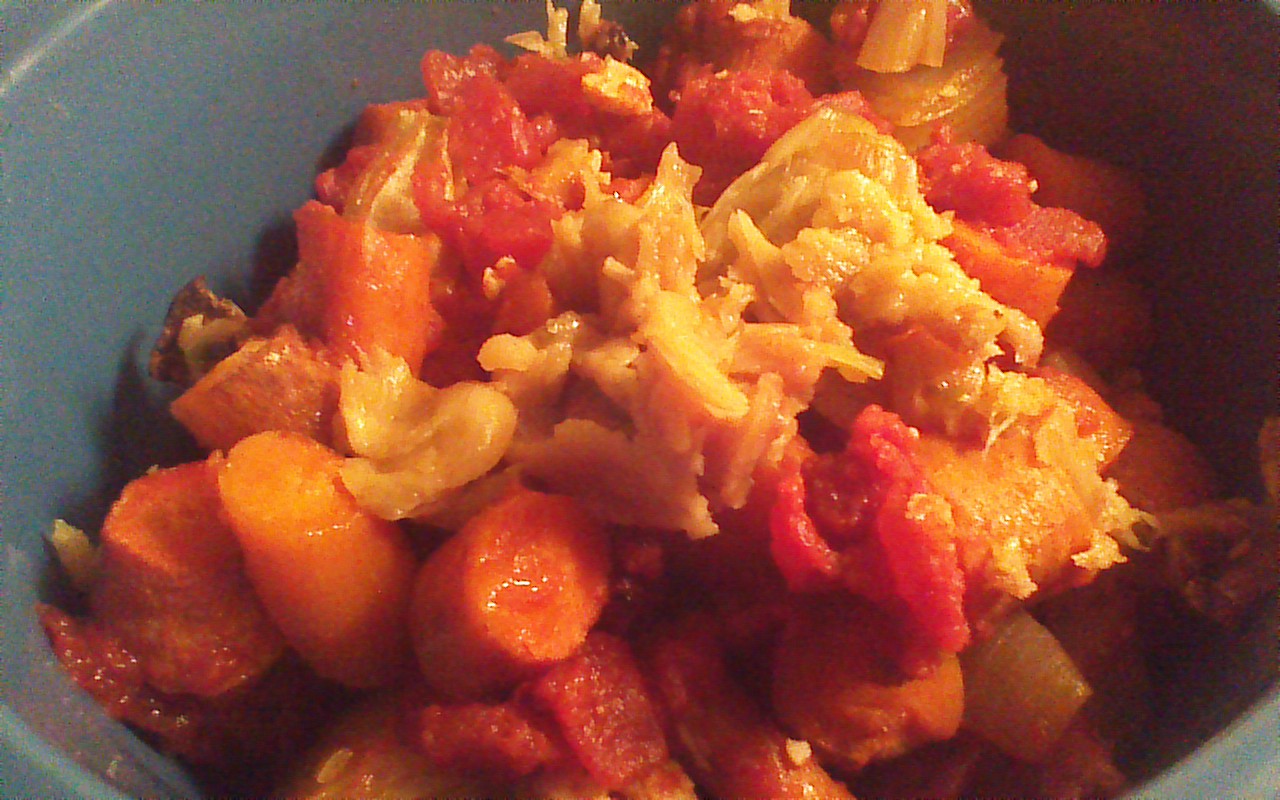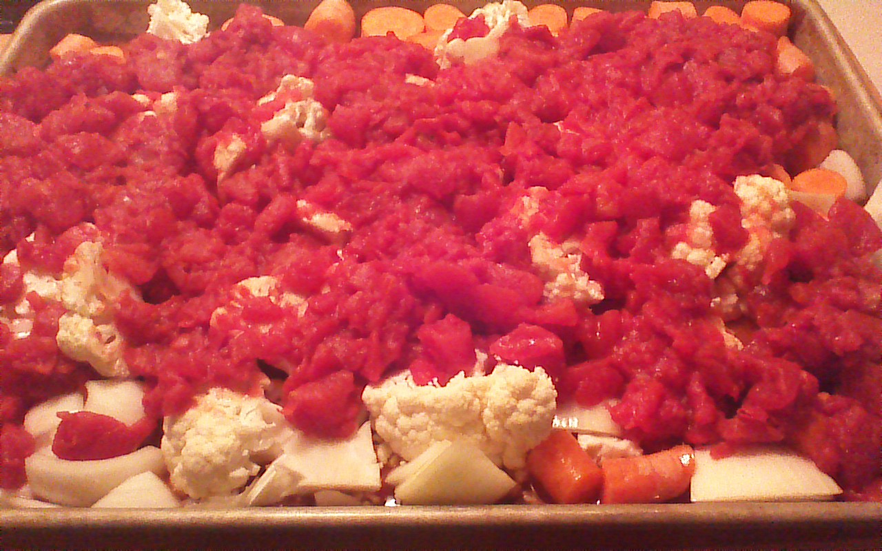 Step 2) Grease a large roasting pan with 1 tablespoon of olive oil. Chop cauliflower, carrots, and onion into bite-size chunks and place on roasting pan. Cover with both cans of tomatoes (including juice).