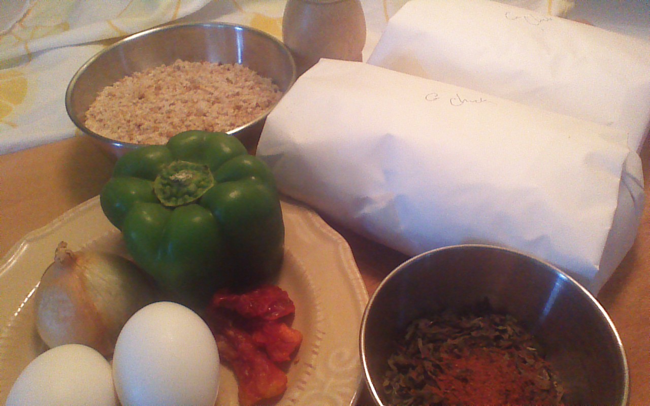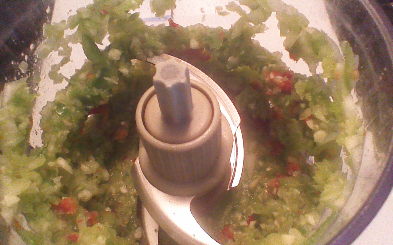 Step 1) In a small blender or food processor, puree green pepper, onion, sundried tomatoes and garlic.
