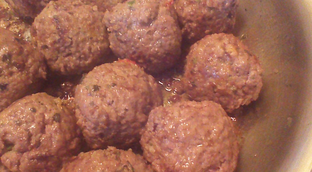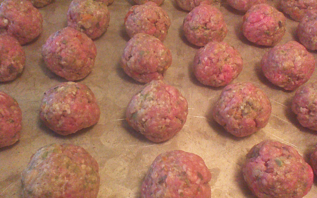 picture470Step 3) Pinch off golf ball size pieces of ground beef mixture and roll into balls.  Place one inch apart on shallow baking pans (you’ll need at least two).  Cover with foil and chill for 30 minutes.