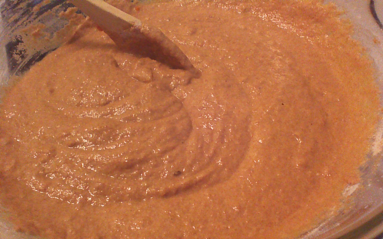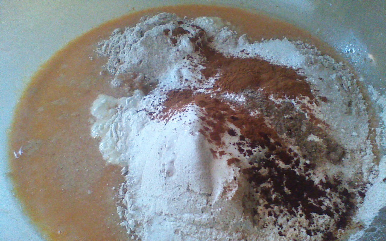 Step 1) Combine pumpkin, sugar, skim milk, eggs, and oil in a large bowl. Mix well.