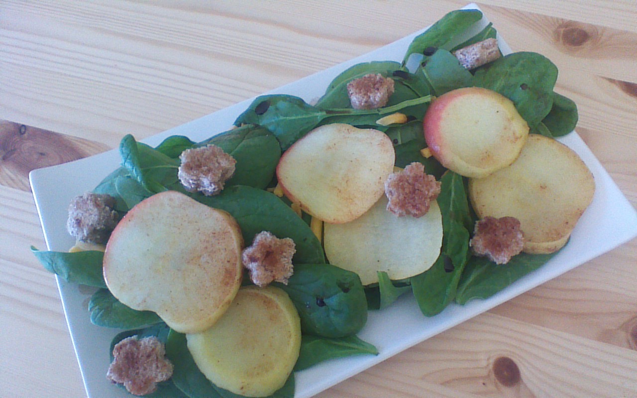 1. More like very, very lightly fried apples. I can’t call them sautéed, because there is no stirring, they’re just fried in whatever little speck of butter might remain from making croutons. I love this salad.