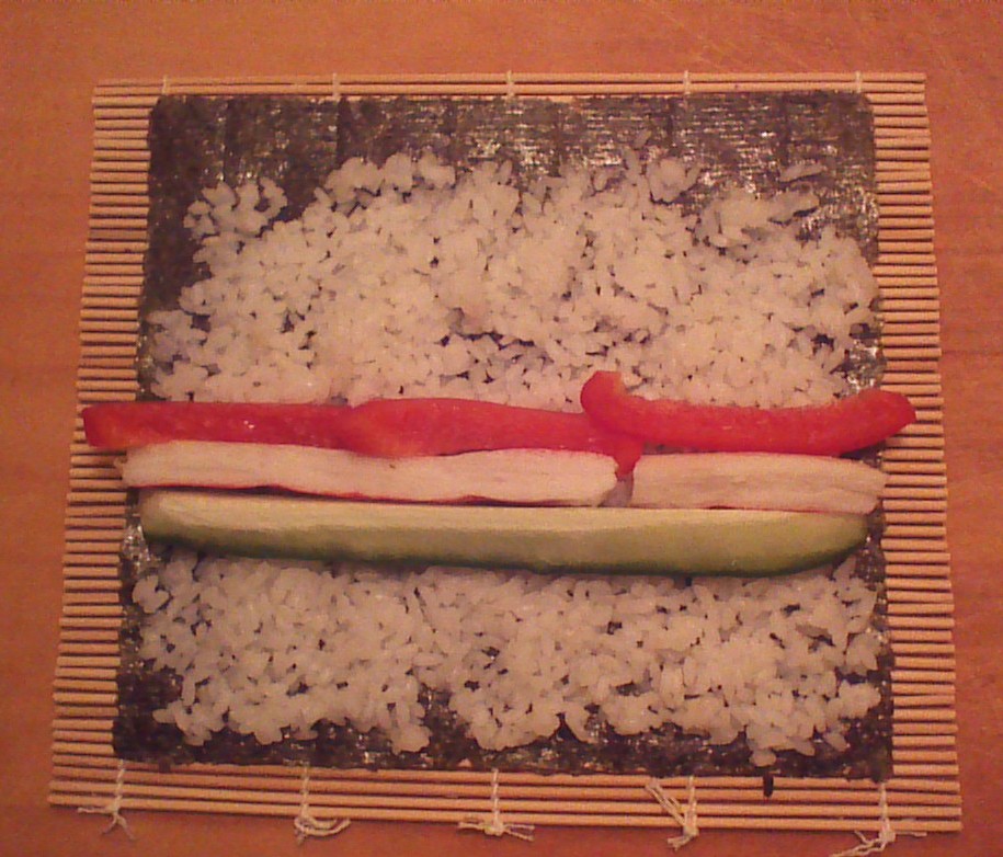 picture680  Step 8) Place your fillings over the rice about 1/3 of the way up from the bottom of the nori sheet, as shown.