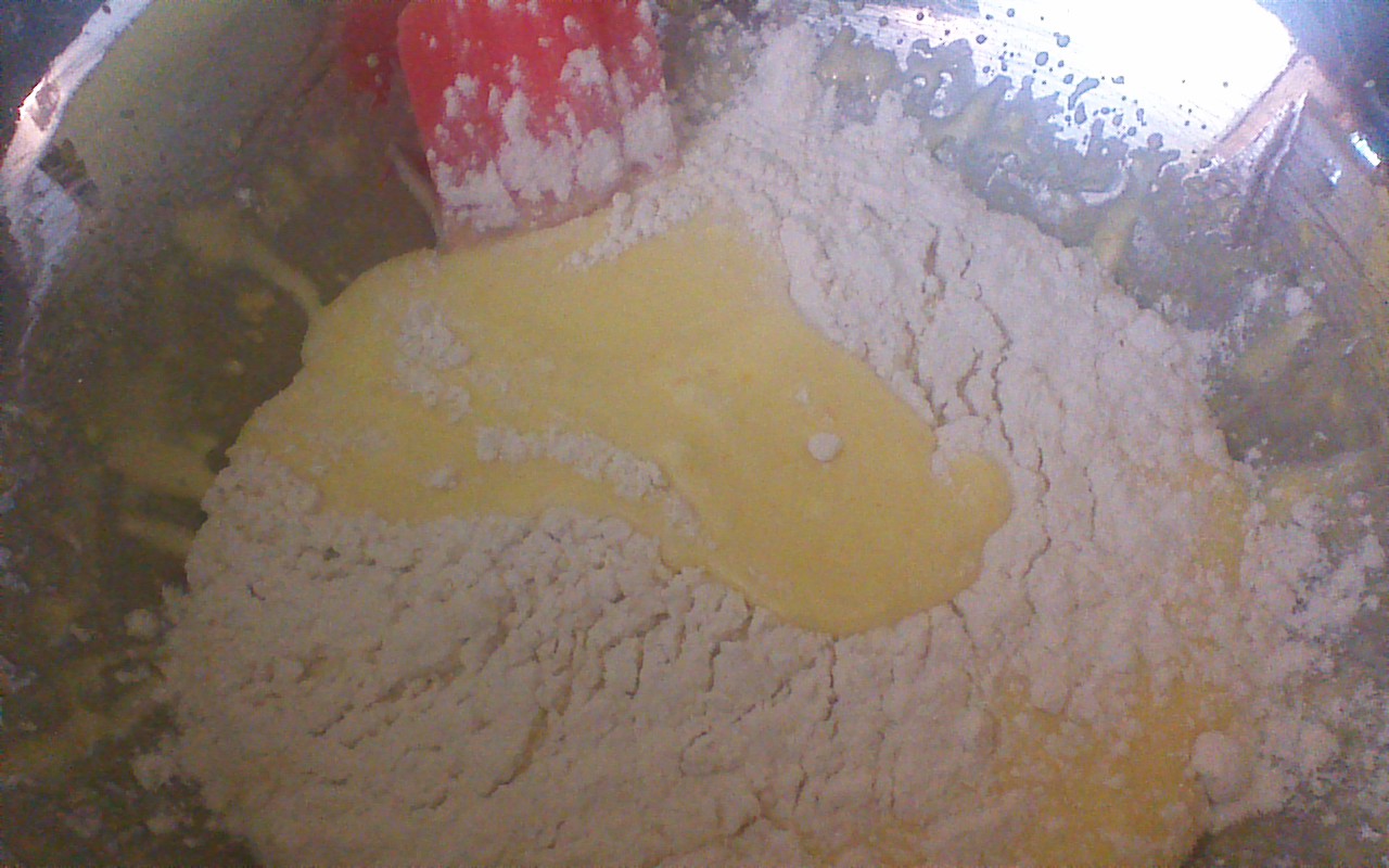 yolk mixture, 1/4 cup at a time. In other words, sprinkle 1/4 cup of flour over the egg yolk mixture, and gently fold the egg yolk mixture over the flour using a rubber scraper. Repeat until all flour has been added. Do NOT over mix.