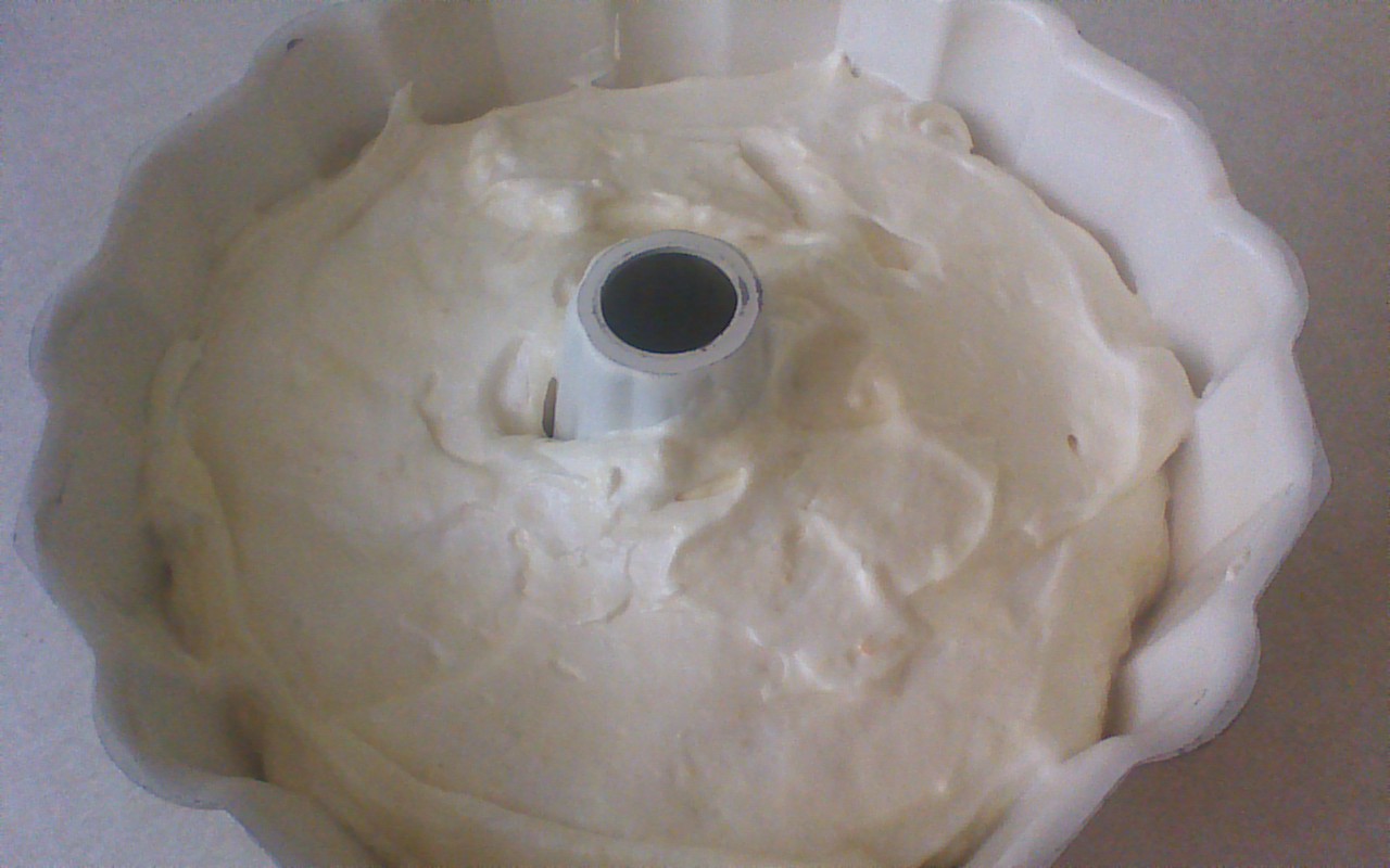 Step 5) Transfer the batter into an ungreased tube pan, approximately 10 inches in diameter (“standard” size). Bake in a preheated 325 degree oven for approximately 55 minutes. The top of the