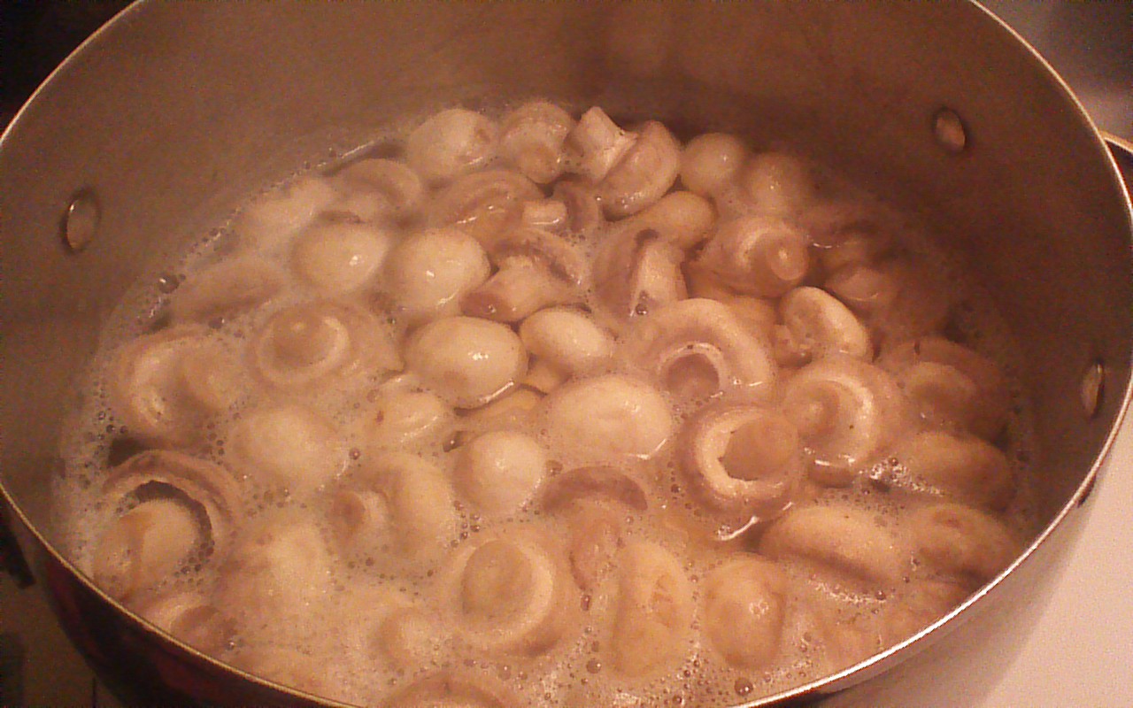 Step 2) Add mushrooms to pot and simmer, covered, 10 minutes.