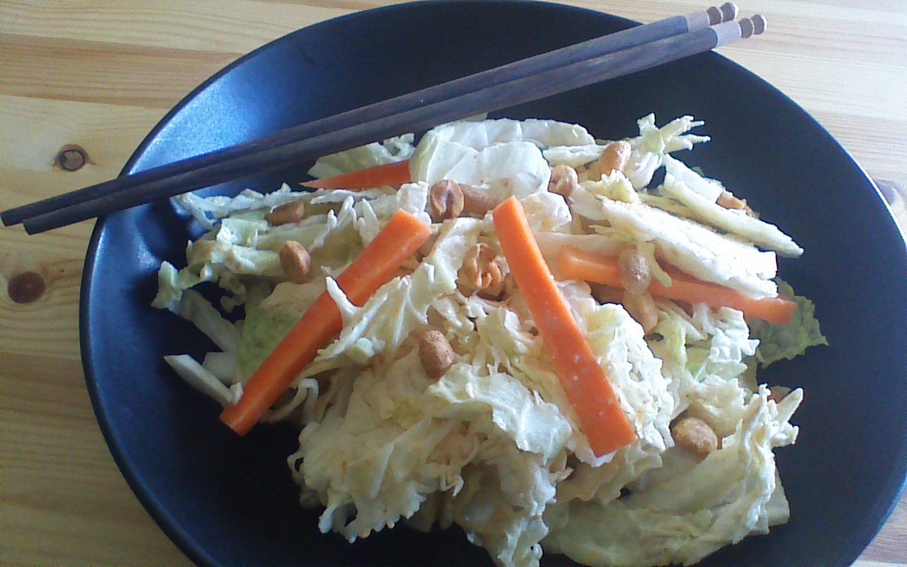 You’ll notice chopsticks in the photo, above. If your children usually eat with a fork, try serving this dish with chopsticks… the long, thin slices of cabbage are relatively easy to pick up, and (in my experience anyway) the novelty of chopsticks can be enough to compel reluctant cabbage eaters to try a few bites. The pleasing peanut flavor with just a bit of zippy tang will keep them engaged!