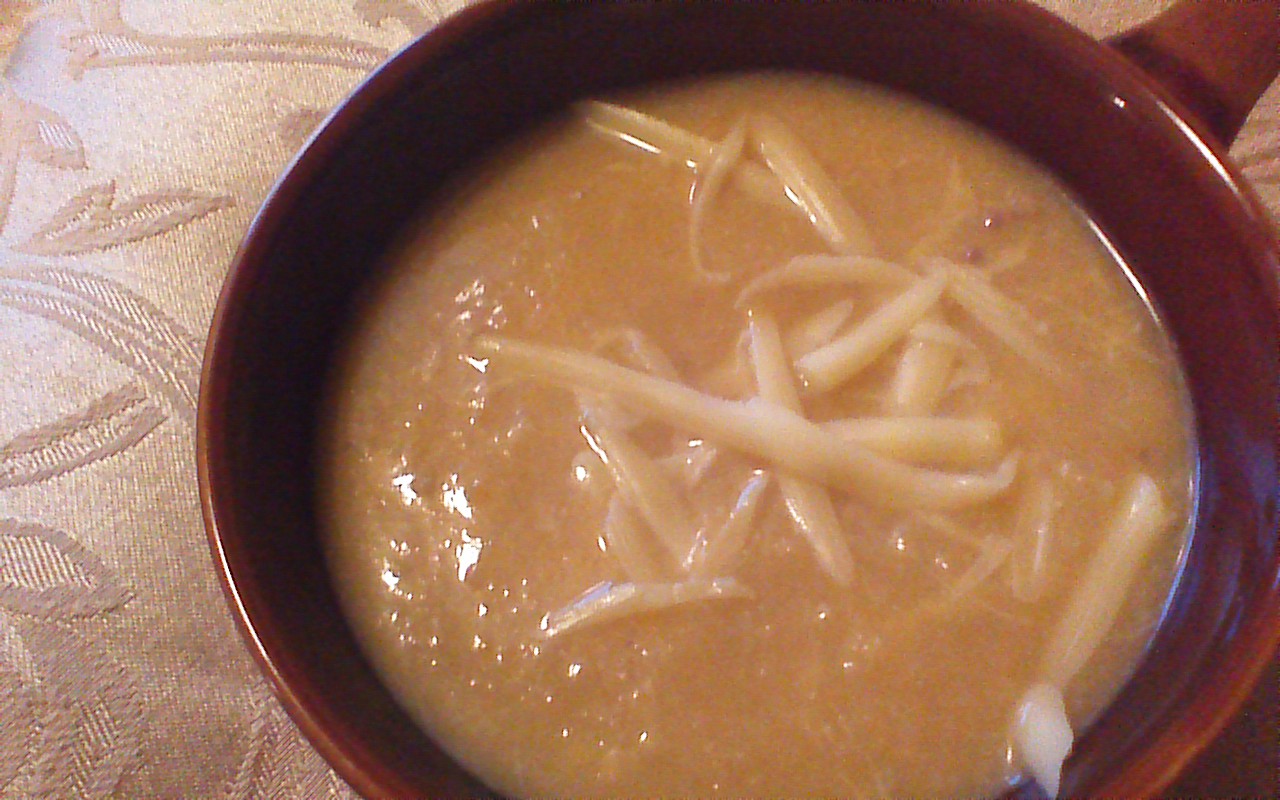 Step 3) Ladle soup into bowls and top with a few strips of grated cheese, a sprinkle of chives, and/or a few bacon crumbles (optional).