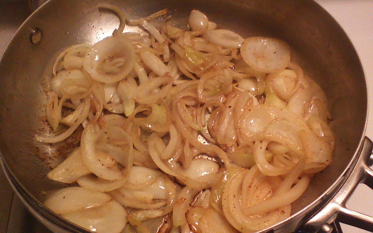 Step 3) Add sliced onion and sugar to pan with the bacon fat. Sautee onion in bacon fat over medium heat until onions are soft and lightly caramelized. Using a slotted spoon, remove onions from pan (do not wash pan!) and set aside.