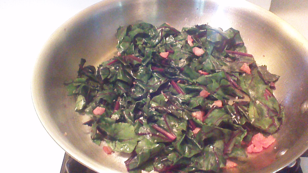 We’re enjoying a two ingredient, three minute nutritional powerhouse today.  For less than 100 calories and 3 grams of fat, we’ll get more than a full day’s worth of Vitamin K and Vitamin A.  We’ll also get over one-third of the Vitamin C we need today, along with a healthy dose of fiber and a few grams of protein.  And, there’s bacon.  Ready? All you need is a slice of bacon, and the leafy tops from a bunch of beets.