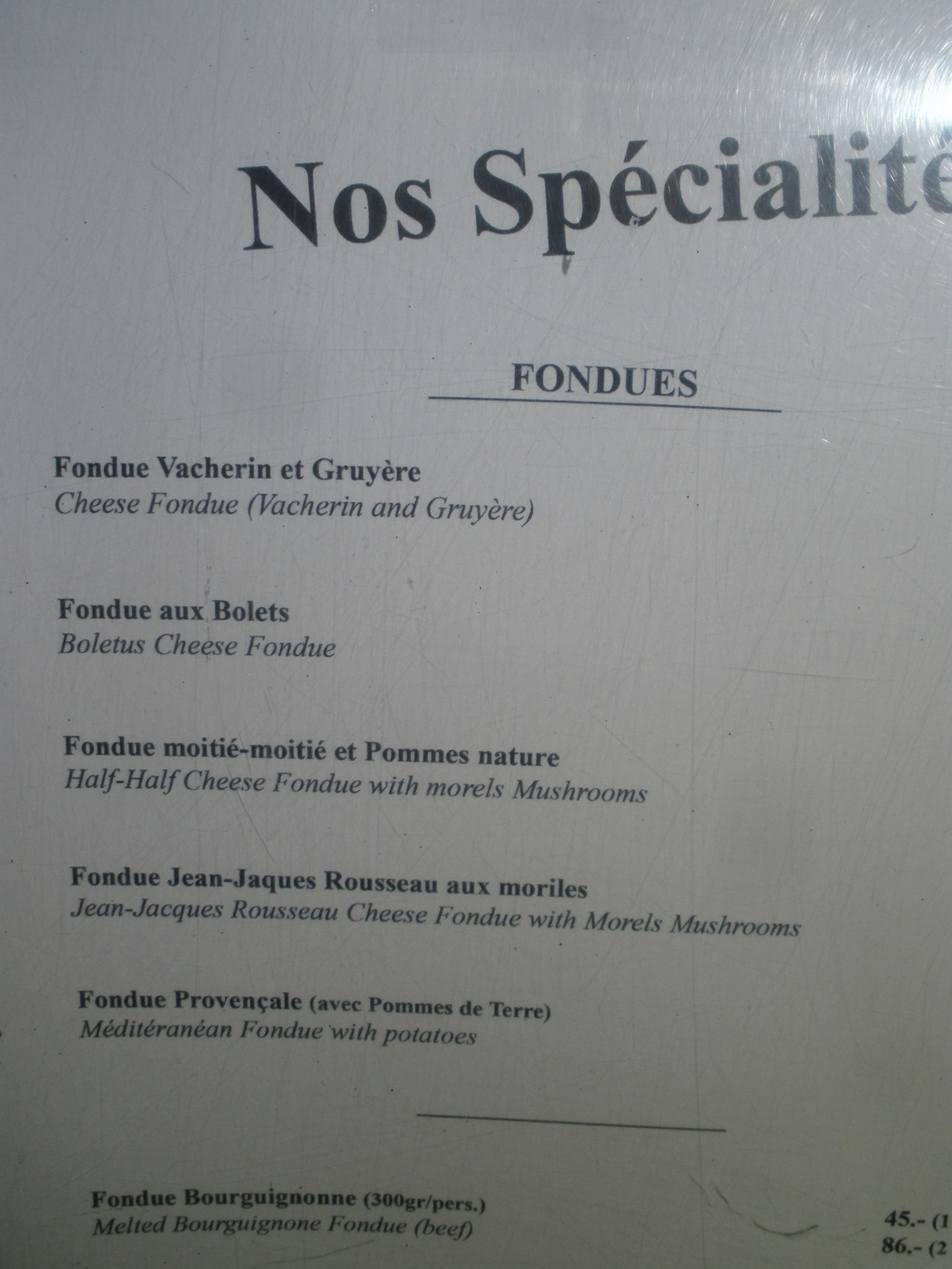 A few notes on Swiss fondue.  First, cheese fondue is the only “traditional” Swiss fondue, and is served with cubed bread – only – for dipping.  If you find yourself in a Swiss restaurant which serves chocolate fondue, or offers all sorts of weird things to dip in cheese fondue, you have wandered into a tourist trap!  Second, fondue is traditionally served as the main course in Switzerland.  Don’t fill up on appetizers… fondue is a hearty dish!  Third, if you are looking for a quiet, serene dinner, a fondue restaurant may not be the place for you.  I enjoyed the rhythmic chopping of bread cubes and whistle of steamers cleaning fondue pots, but be aware that the ambiance is quite lively.