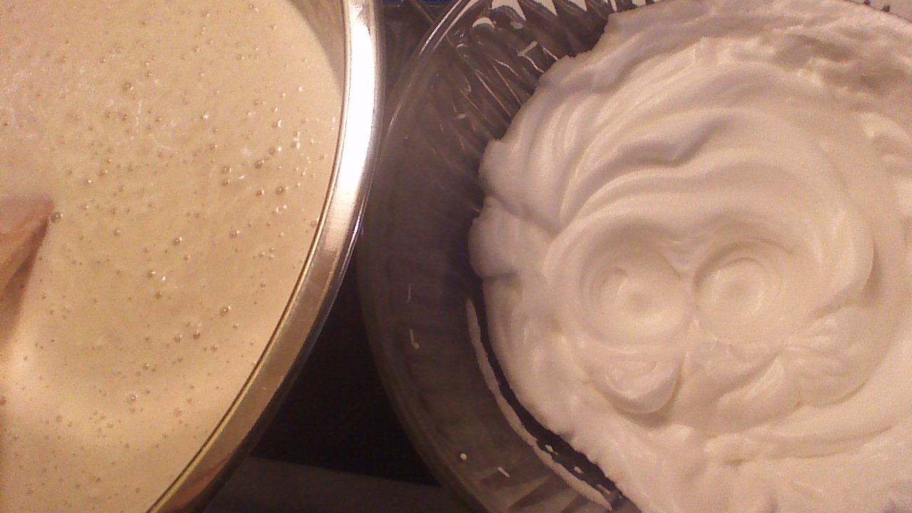 Step 3) In a scrupulously clean bowl, beat the 4 egg whites with an electric mixer until soft peaks form when you lift the beaters out of the bowl.  This could take up to 5 minutes – be WIN_20141022_174218patient.
