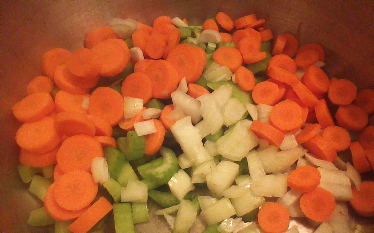 Step 1) Combine broth, celery, carrots, and onion in a large pot. Bring to a gentle boil.