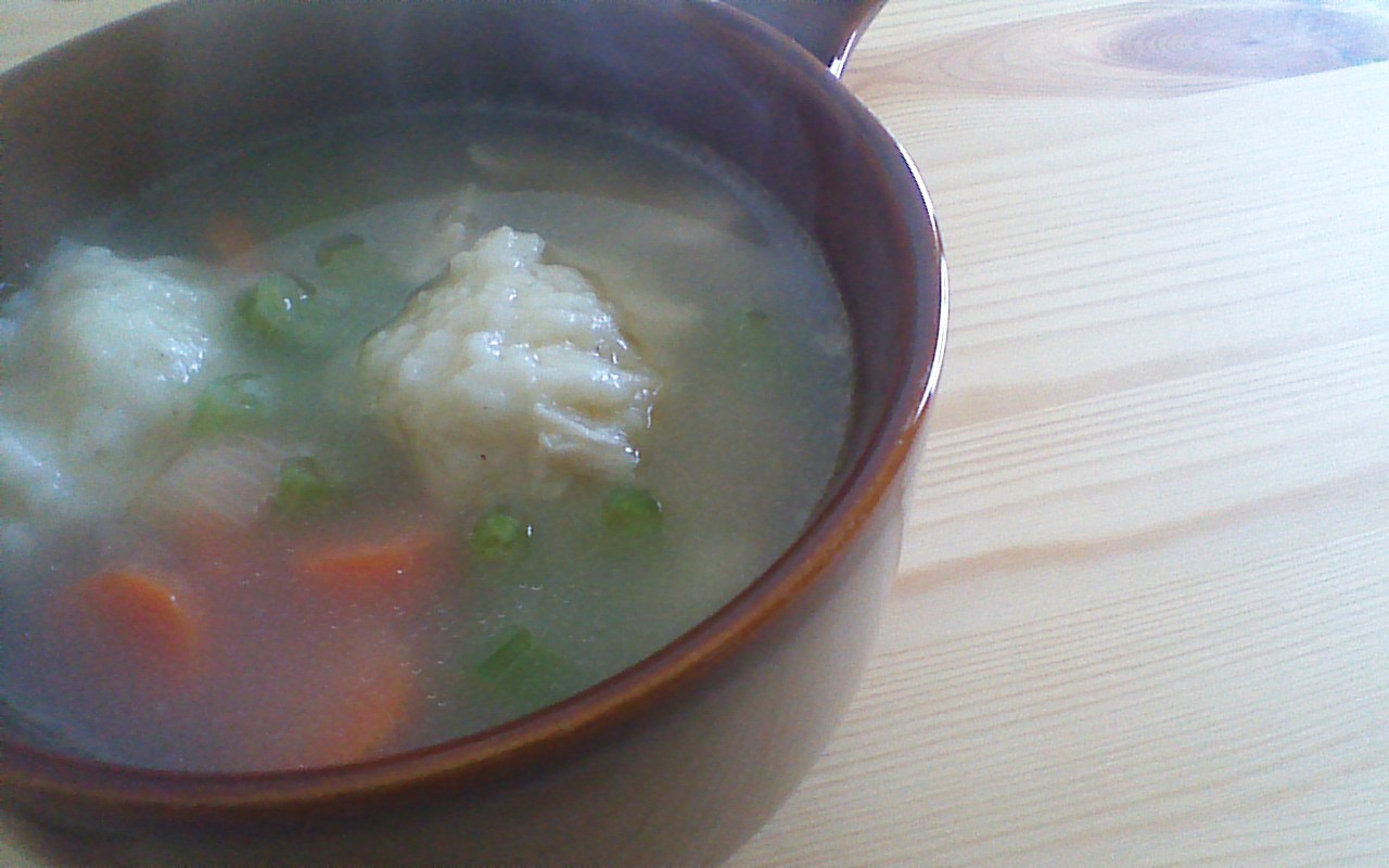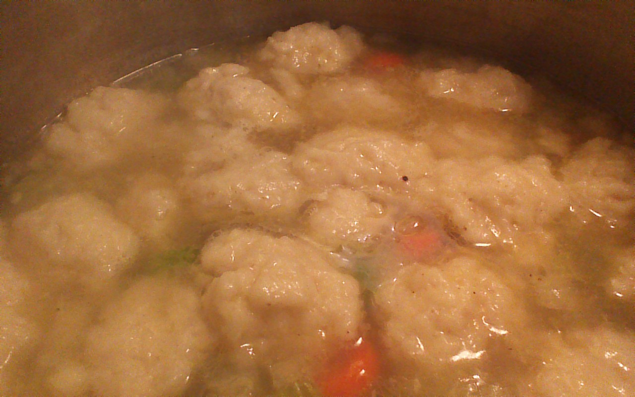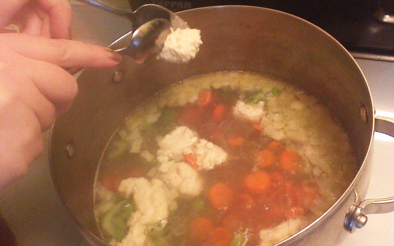 Step 3) Using two teaspoons, drop dumpling dough into gently boiling soup as shown. Simmer, covered, for 10 minutes. Do not stir or lift lid for 10 minutes.