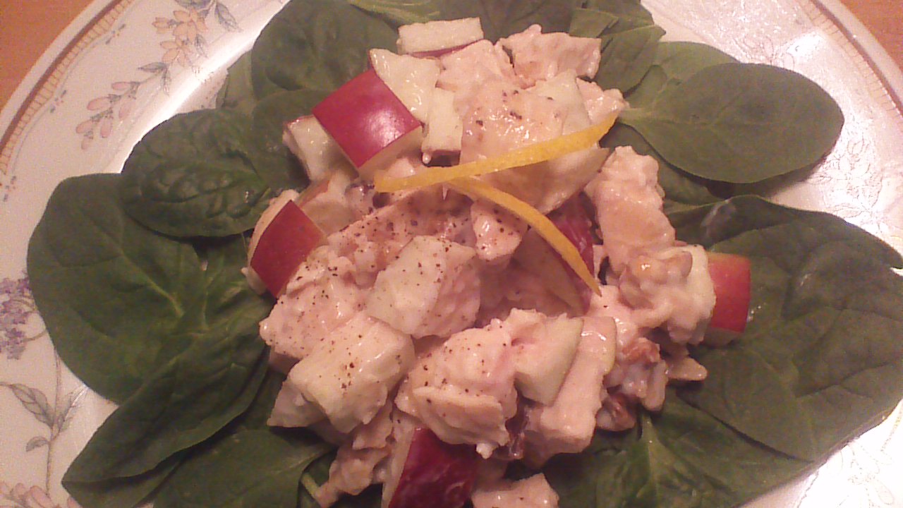 Combine all ingredients except for spinach leaves. Toss with a fork until well combined. Arrange turkey mixture over a bed of spinach leaves. Sprinkle with salt and pepper, and garnish with lemon peel. Done!