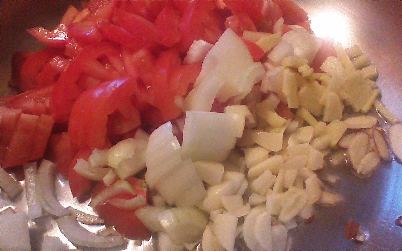 Step 1) Make the paste which will serve as the base of your curry. To do this, combine tomato, onion, ginger, garlic, almonds, and 1/3 cup water in a sauté pan (see above). Cover and simmer over low heat for 10 minutes, until all ingredients are cooked and softened. Cool, then puree in a blender or food processor. Set aside.