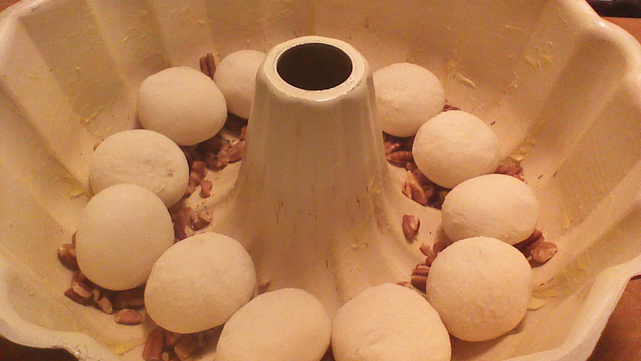 Step 2) Sprinkle pecans evenly on bottom of greased Bundt pan. Place frozen roll dough on top of pecans.
