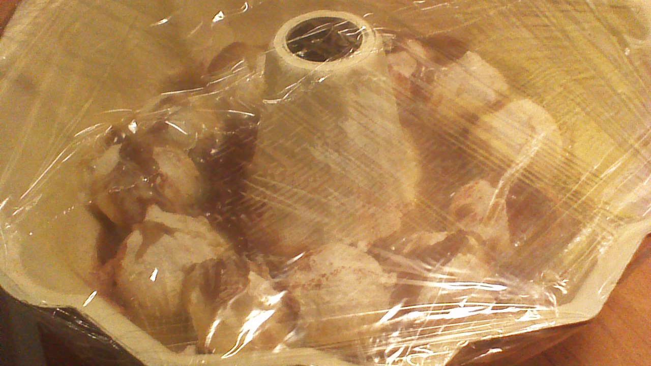 Step 6) In the morning, preheat your oven to 350 degrees. Remove plastic wrap from Bundt pan and bake (not too close to the top of the oven!) for 20 minutes.