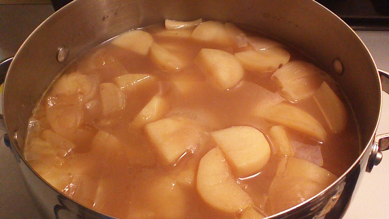 Step 3) Add all ten pounds of peeled, quartered potatoes and both peeled, quartered onions to the stockpot with the ham broth. Add water as needed so that the liquid level in the pot is 2 inches above the potatoes. Bring to a boil, then reduce heat to a gentle simmer. Simmer, covered, stirring occasionally until the potatoes are very soft. This will take about an hour, longer if the potatoes were cold.